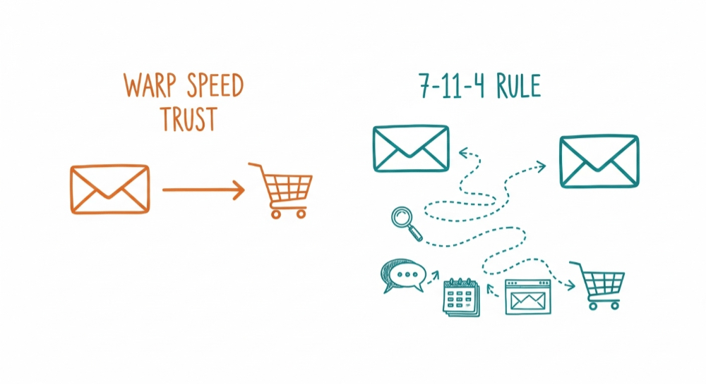 - Trust beats time. You can spend 7 hours and 17 touchpoints with a brand, but if you smell B.S., you bounce. But one real, "no sugarcoating" email? It's enough to flip a skeptic into a buyer.